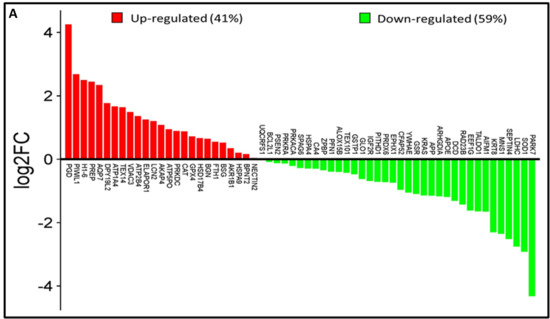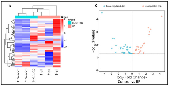 Comparative global lysine acetyl-proteomic profiling of spermatozoa proteins between Control (fertile donors) and idiopathic infertile patients (IIP). (A) Bar graph showing thelog2 fold change of lysine-acetylated differentially expressed proteins (DEPs) in idiopathic infertile patients with respect to control (FD) (Red bars: Up Regulated proteins; Green Bars: Down Regulated proteins). (B) Heat map with hierarchical clustering of lysine-acetylated proteins. Column clustering segregated control and IIP groups, while row clustering separated overexpressed DEPs in IIP from underexpressed DEPs. Blue and red indicate low and high expression levels, respectively (see scale bar). (C) Volcano plot of lysine-acetylated stress proteins in control versus IIP spermatozoa. Red and blue dots indicate significantly altered proteins with both large fold changes (x-axis) and high statistical significance (−log10 p value, y-axis). The horizontal dashed line marks the significance threshold (p ≤ 0.05), while vertical dashed lines indicate fold-change cutoffs (−1.0 ≤ FC ≥ 1.0), identifying over-expressed (right) and under-expressed (left) proteins.