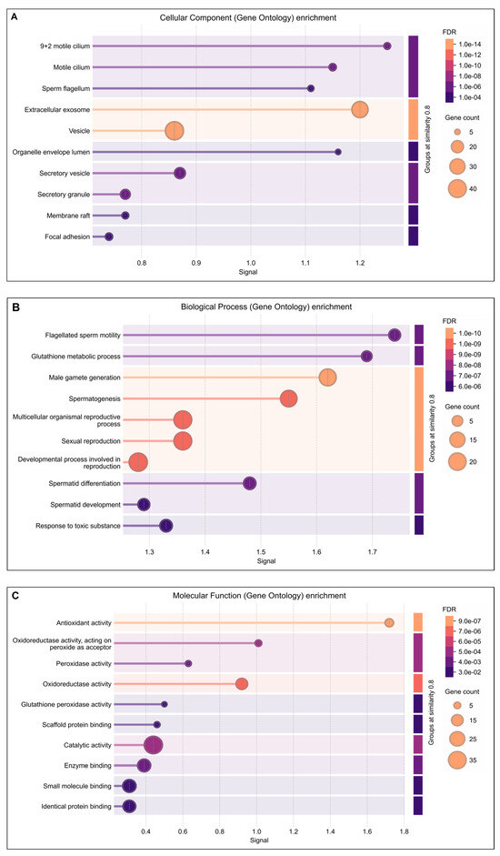 Functional annotation using advanced bioinformatics resources, including GO Term Finder, UniProt, and DAVID, demonstrated that several lysine-acetylated proteins are implicated in ROS-mediated oxidative stress regulation and antioxidant-related multifunctional pathways. In this study, GO cellular component analysis indicated enrichment of acetylated proteins in the motile cilium, sperm flagellum, extracellular exosomes, and secretary vesicles (Figure 2A). The biological process analysis highlighted significant involvement of these proteins in flagellated sperm motility, glutathione metabolism, spermatogenesis, spermatid differentiation and development, and response to toxic substances (Figure 2B). Furthermore, the molecular function analysis revealed strong associations with antioxidant activity, oxidoreductase activity, peroxidase activity, and glutathione peroxidase activity (Figure 2C).