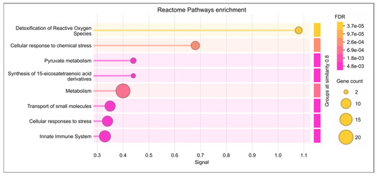 Reactome pathway analysis of the lysine-acetylated DEPs revealed significant dysregulation of pathways related to detoxification of ROS, cellular response to stress, and pyruvate metabolism (p ≤ 0.05). These DEPs were also strongly associated with oxidative stress regulation and antioxidant defense mechanisms (Figure 3). Further analysis using IPA identified their involvement in free radical scavenging and molecular transport (Table 1). Within the reproductive system disease pathway, IPA highlighted a strong link between these DEPs in infertility as well as asthenozoospermia (p < 0.05) (Table 1). Moreover, under the diseases and disorders category, enriched functions were predominantly associated with reproductive diseases and infertility.