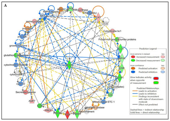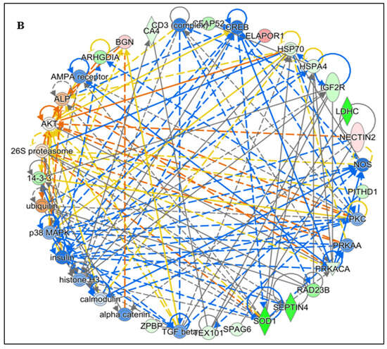 Functional Analysis of the top (A) Free Radical Scavenging and Molecular Transport and (B) Reproductive system diseases Network by Ingenuity Pathway Analysis (IPA) software (https://digitalinsights.qiagen.com/IPA, accessed on 14 October 2025) of the differentially expressed lysine acetylated proteins (DEPs) from IIP group with respect to control group.