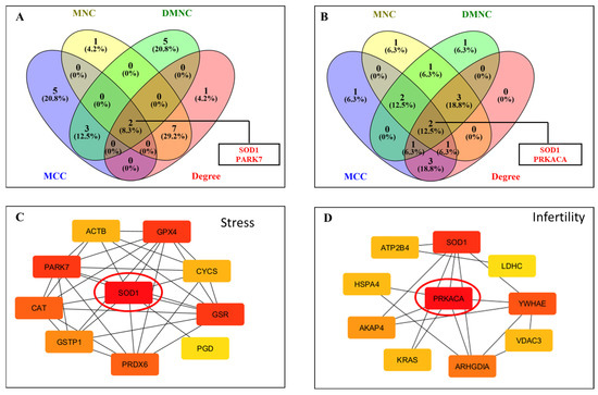 Construction of protein–protein interaction (PPI) networks of lysine-acetylated proteins in idiopathic infertile patients compared with controls. (A) Venn diagram analysis showing overlapping differentially expressed proteins (DEPs) identified by four CytoHubba algorithms (MNC, MCC, DMNC, and Degree) in network 1. Two hub proteins, SOD1 and PARK7, were identified. (B) Venn diagram analysis showing overlapping DEPs identified by the same four algorithms in network 2. Two hub proteins, PRKACA and SOD1, were identified. (C) PPI network highlighting SOD1 as a central hub protein interacting with key antioxidant proteins. (D) PPI network highlighting PRKACA as a central hub protein interacting with proteins involved in energy metabolism and signaling.