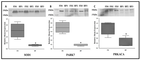 Representative Western blot of hub proteins and corresponding densitometry analysis in spermatozoa of FD: fertile donor (n = 3) and IIP: idiopathic infertile patient (n = 3) with total protein normalization (in arbitrary unit). * p < 0.05 with respect to the control patients. (A) SOD1 (B) PARK 7 (C) PRKACA.