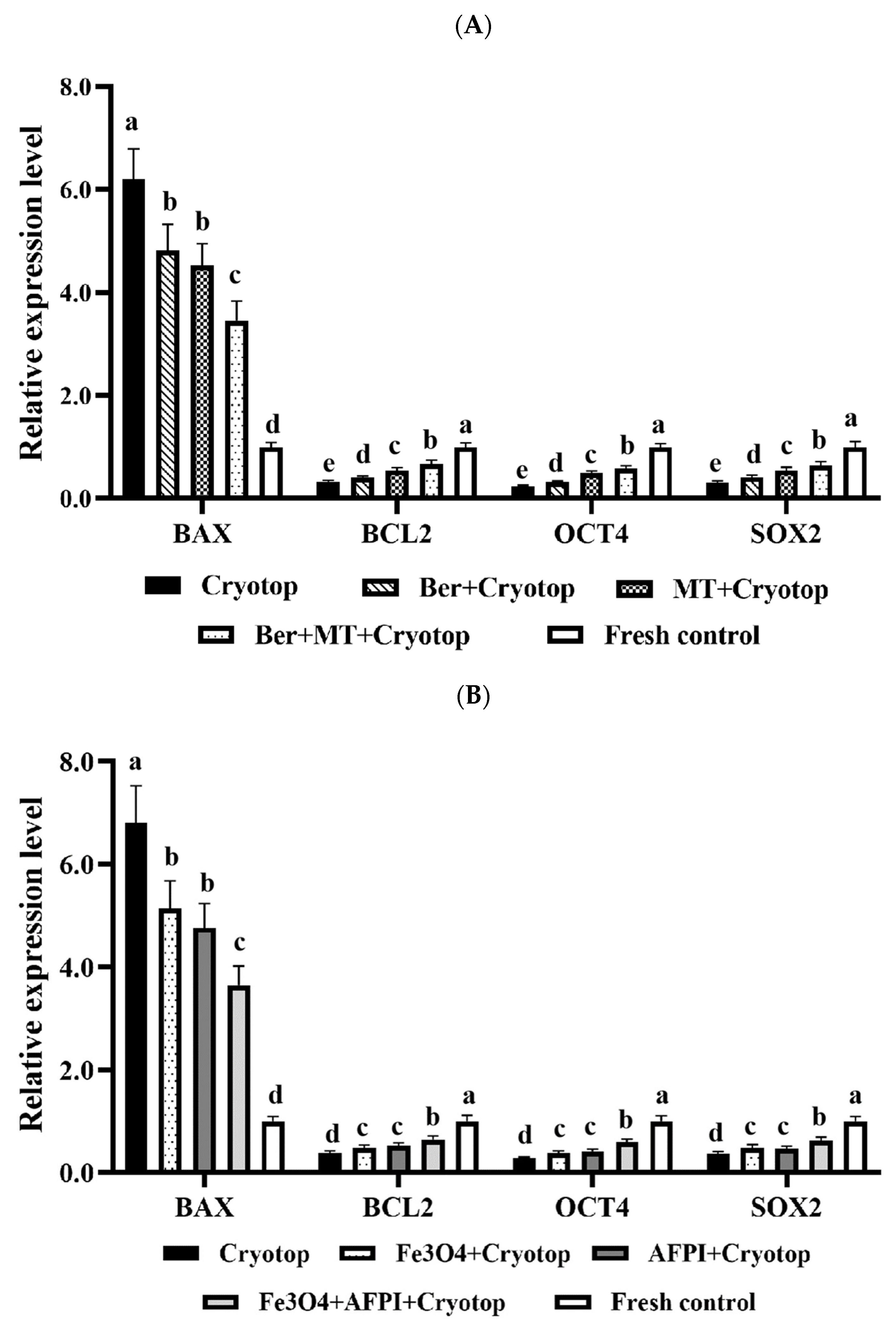 | Berberine + MT + Fe3O4 + AFP + Cryotop | 93.75 ± 8.64 a (180/192) | 90.48 ± 9.45 a (38/42) | 90.70 ± 8.16 a (39/43) | 31.35 ± 6.31 c (n = 30) | 0.39 ± 0.04 a (n = 30) |