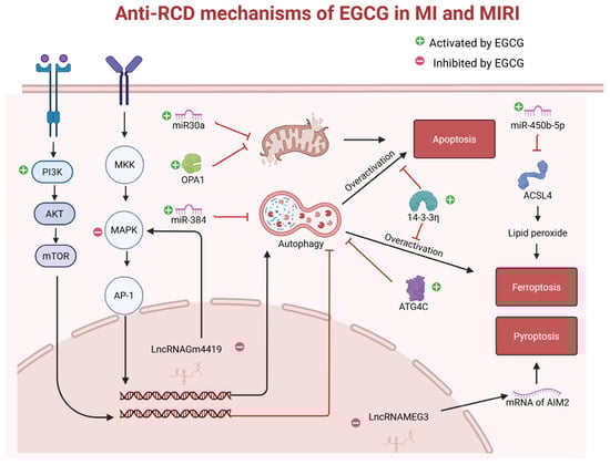 In addition to oxidative stress, inflammatory responses, and mitochondrial damage, MI and MIRI also induce excessive autophagy in CMs, leading to functional impairment and increased apoptosis. The inhibitory effects of EGCG on excessive autophagy and apoptosis have been confirmed in multiple studies [,,]. miR-30a inhibits apoptosis by regulating gene expression, and EGCG treatment in MI mice upregulated miR-30a expression in CMs. Notably, miR-30a can also be transferred to neighboring CMs via exosomes, thereby exerting protective effects []. In recent years, beyond apoptosis, which has been extensively characterized, other forms of RCD—including ferroptosis and pyroptosis—have been recognized as critical contributors to MI and MIRI. Studies have shown that EGCG inhibits ferroptosis in CMs by upregulating 14-3-3η protein [] and miR-450b-5p [] in mice, and suppresses pyroptosis by downregulating long non-coding RNA (LncRNA) MEG3, which reduces the stability of AIM2 mRNA []. Collectively, through multiple pathways, EGCG suppresses RCD in CMs and enhances their survival, and the main anti-RCD mechanisms of EGCG in MI and MIRI are illustrated in Figure 2.
