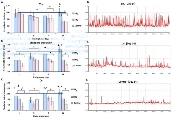 Dynamics of baseline tissue perfusion parameters in rats at early stages of chronic heart failure (CHF) development and after single and multiple treatments with molecular hydrogen. (A) Histogram of perfusion index (MTP) in the studied groups. (B) Histogram of amplitude deviation of blood flow oscillations (σ, standard deviation, flux) in the studied groups. (C) Histogram of coefficient of variation in blood flow oscillations (Cv) in the studied groups. (D) Representative laser Doppler flowmetry (LDF) trace of a rat from the multiple hydrogen treatment group (5H2) on day 14. (E) Representative LDF trace of a rat from the single hydrogen treatment group (1H2) on day 14. (F) Representative LDF trace of a rat from the control group on day 14. Data are shown as mean ± SEM. *—statistically significant difference compared to the intact group (p < 0.05); ▲—statistically significant difference compared to the control group (p < 0.05); #—statistically significant difference between multiple and single hydrogen treatment groups (p < 0.05).