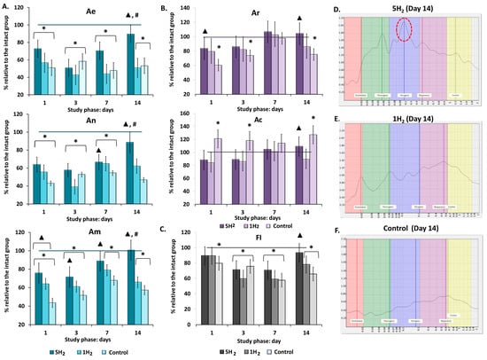 Dynamics of amplitude-frequency characteristics (AFC) of tissue perfusion in rats during early stages of chronic heart failure (CHF) development and after single and multiple treatments with molecular hydrogen. (A) Histograms of active regulatory mechanisms in the studied groups (endothelial (Ae), neurogenic (An), myogenic (Am) oscillations). (B) Histograms of passive regulatory mechanisms in the studied groups (respiratory (Ar), cardiac (Ac) oscillations). (C) Histogram of flux motion index (FI). (D) Laser Doppler flowmetry (LDF) spectrum of a rat from the multiple hydrogen treatment group (5H2) on day 14 (Am is the dominant of the study (highlighted in red)). (E) LDF spectrum of a rat from the single hydrogen treatment group (1H2) on day 14. (F) LDF spectrum of a rat from the control group on day 14. Data are presented as mean ± SEM. *—statistically significant difference compared to the intact group (p < 0.05); ▲—statistically significant difference compared to the control group (p < 0.05); #—statistically significant difference between multiple and single hydrogen treatment groups (p < 0.05).