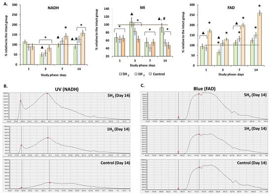 Following the confirmation of H2′s role in increasing nutritive blood flow through the activation of local regulatory factors, the metabolic state of tissues was assessed. Quantitative evaluation of endogenous fluorescence intensity of respiratory chain coenzymes allows insight into cellular metabolic activity []. To assess the effects of inhalation of 2% H2 on intracellular metabolism, we measured the fluorescence levels of reduced NADH and oxidized FAD. Repeated administration of high doses of adrenaline significantly increased the fluorescence levels of these coenzymes over the subsequent 14 days. At the same time, a gradual decrease in the metabolic index (MI) was observed, with the minimum values (47% of physiological norm) recorded on day 14 (Table 3, Figure 3). Our results indicated that repeated administration of H2 significantly reduced NADH and FAD levels compared to the control group and the group receiving a single H2 inhalation. Conversely, the metabolic index (MI) increased and was 73.68% higher than control values by day 14. Collectively, these findings indicate that inhalation of 2% H2 effectively supports aerobic mitochondrial respiration, preventing excessive ROS production and the development of oxidative stress in rats during the early stages of heart failure progression (Figure 3).
