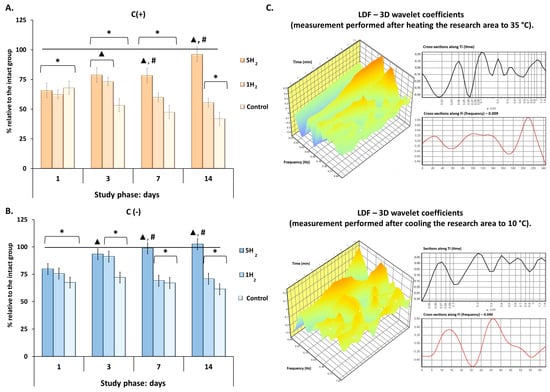 Temperature tests were conducted to assess the adaptive capacity of tissues by cooling the tissue to 10 °C to reduce microcirculatory and metabolic activity, and heating it to 35 °C to increase activity, using the “LAZMA-TEST” device. The study was conducted in a room with a constant ambient temperature of 22 ± 1 °C. The skin temperature at the base of the rat’s tail during baseline testing was 31.2 ± 0.4 °C. Temperature was monitored using an integrated thermocouple and maintained at this level throughout the experiment. The cold test recording duration was 1 min after cooling the tissue to 10 °C to prevent the onset of cold-induced vasodilation. The measurement period for the heated tissue was 4 min after raising the temperature of the test area to 35 °C.