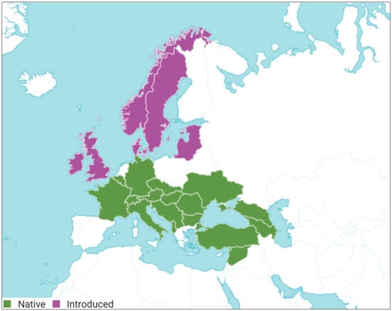 Distribution of Cornus mas L. (native and introduced). Adapted from Cornus mas L., Plants of the World Online, © Royal Botanic Gardens, Kew, licensed under CC BY 3.0. Source: https://powo.science.kew.org/taxon/urn:lsid:ipni.org:names:271612-1 (accessed on 26 November 2025). Changes were made to the original map.