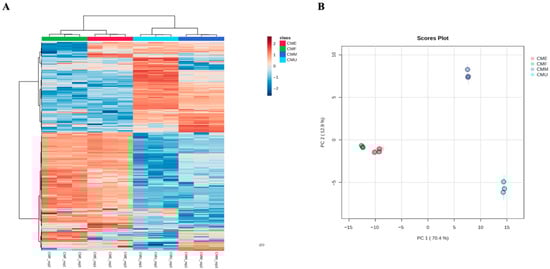 Unsupervised statistical findings from both hierarchical clustering heat map (A) and principal component analysis score plot (B). CME—enzyme-assisted extraction extract; CMF—decoction extract; CMM—maceration extract; CMU—ultrasound-assisted extraction extract.