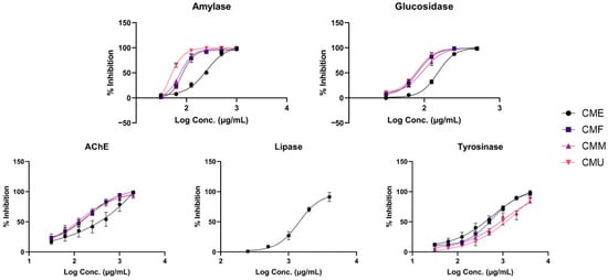 The concentration-dependent enzyme-inhibitory activity (expressed as logC, in μg/mL) of Cornus mas fruit extracts. Values represent mean ± standard deviation (SD) of triplicates (n = 3). CME—enzyme-assisted extraction extract; CMF—decoction extract; CMM—maceration extract; CMU—ultrasound-assisted extraction extract.