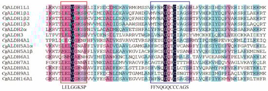 Multiple sequence alignment of CgALDHs. Black shading indicates identical residues, pink shading indicates similar residues that are more than 80% similar, and blue shading indicates similar residues that are more than 50% similar. The red boxes indicate the conserved glutamic active sites, and the blue boxes indicate the conserved glutamic cysteine active sites.