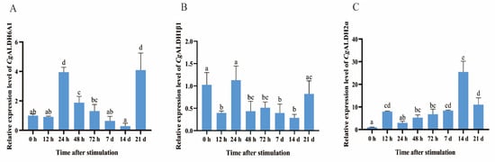 The mRNA expression levels of six CgALDHs in gills after exposure to 28 °C. (A): CgALDH6A1; (B): CgALDH1β1; (C): CgALDH2α. Vertical bars represent the mean ± S.D. (n = 3). Significant differences between groups are indicated by different letters (p < 0.05).