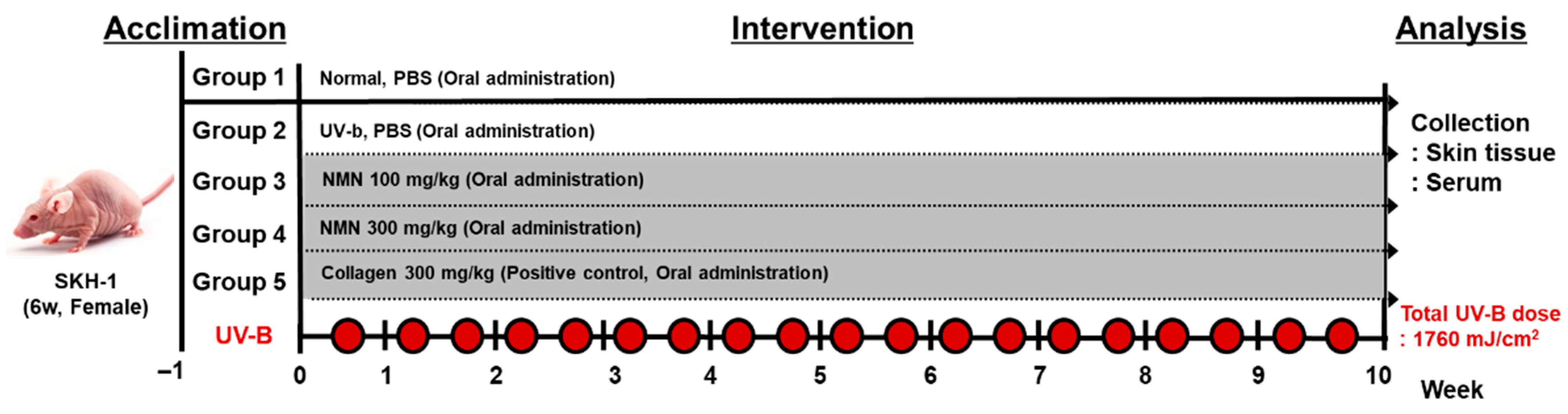 - Zhou, X.; Du, H.-H.; Long, X.; Pan, Y.; Hu, J.; Yu, J.; Zhao, X. β-Nicotinamide mononucleotide (NMN) administrated by intraperitoneal injection mediates protection against UVB-induced skin damage in mice. J. Inflamm. Res. 2021, 14, 5165–5182. [Google Scholar] [CrossRef]