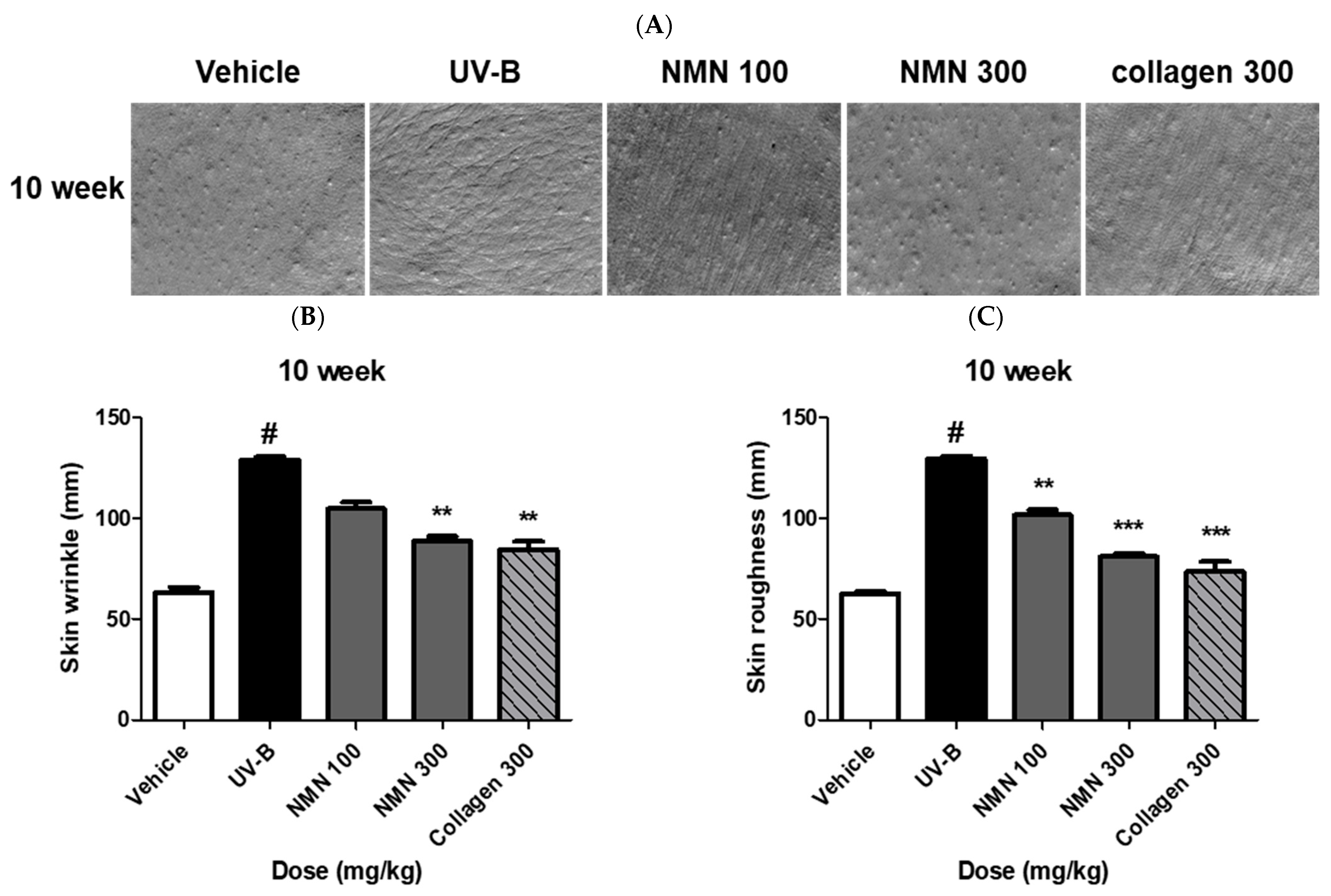 3.3. Effects of NMN Administration on Skin Wrinkles and Roughness