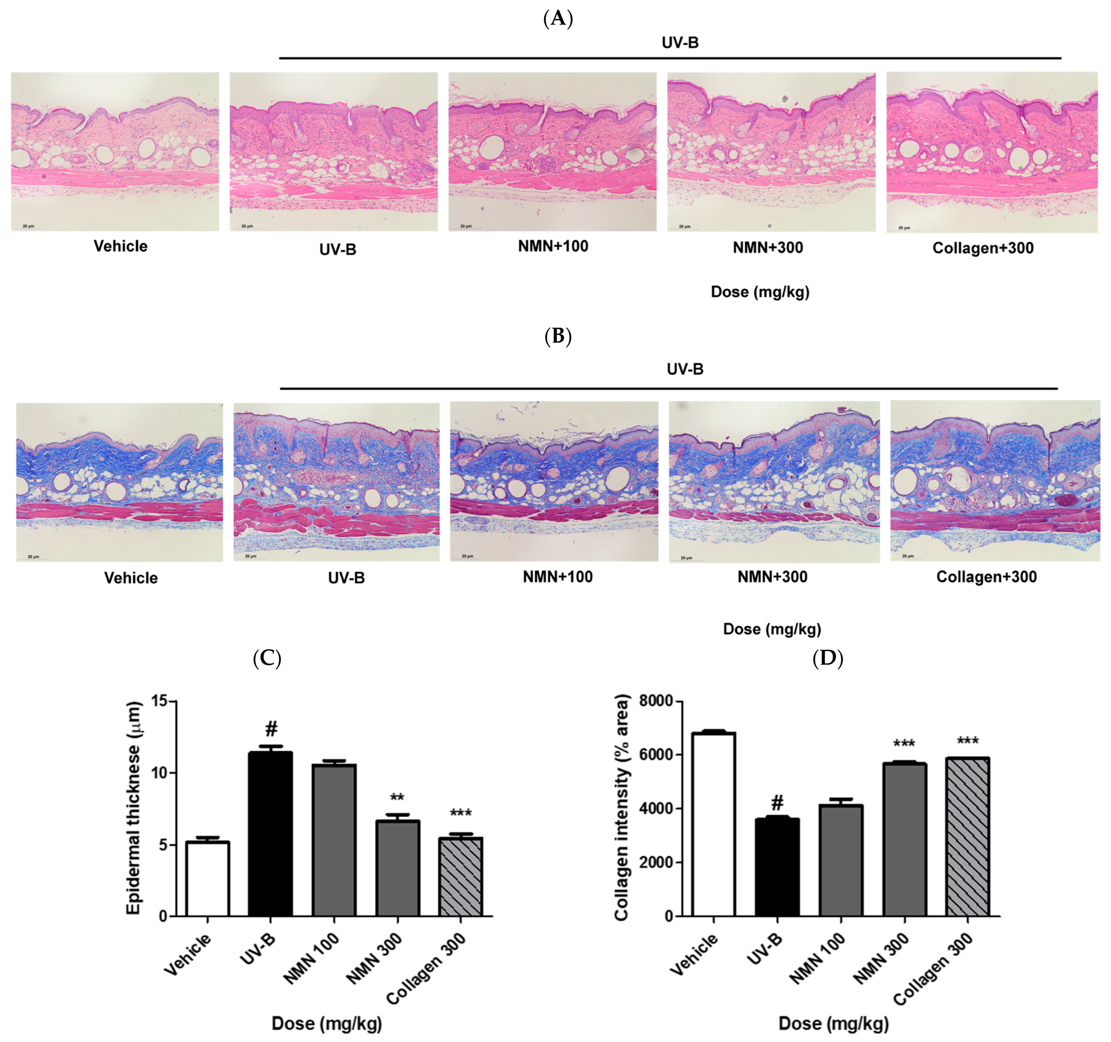 3.4. Effects of NMN Administration on Epidermal Thickness and Collagen Fibers