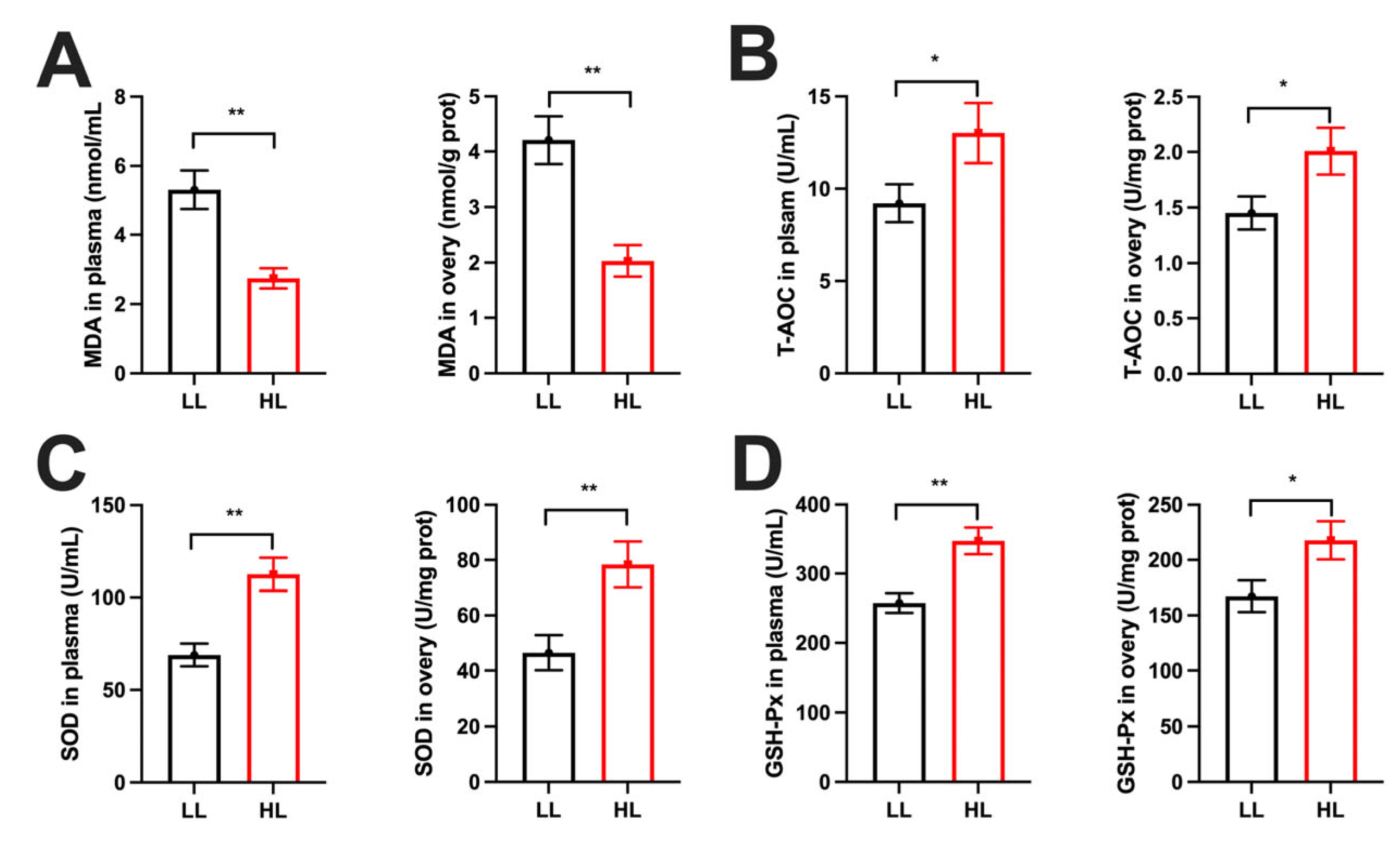 3.4. Differences in Oxidative Stress Between the HL and LL Group Ducks