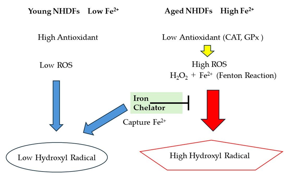 Takemoto K, Ozaki A, Tanii Y, Yagi M, Ichihashi M, Ando H. Iron Chelation Reduces Intracellular Hydroxyl Radicals in Normal Human Dermal Fibroblasts Independently of Aging. Antioxidants. 2025; 14(12):1437. https://doi.org/10.3390/antiox14121437