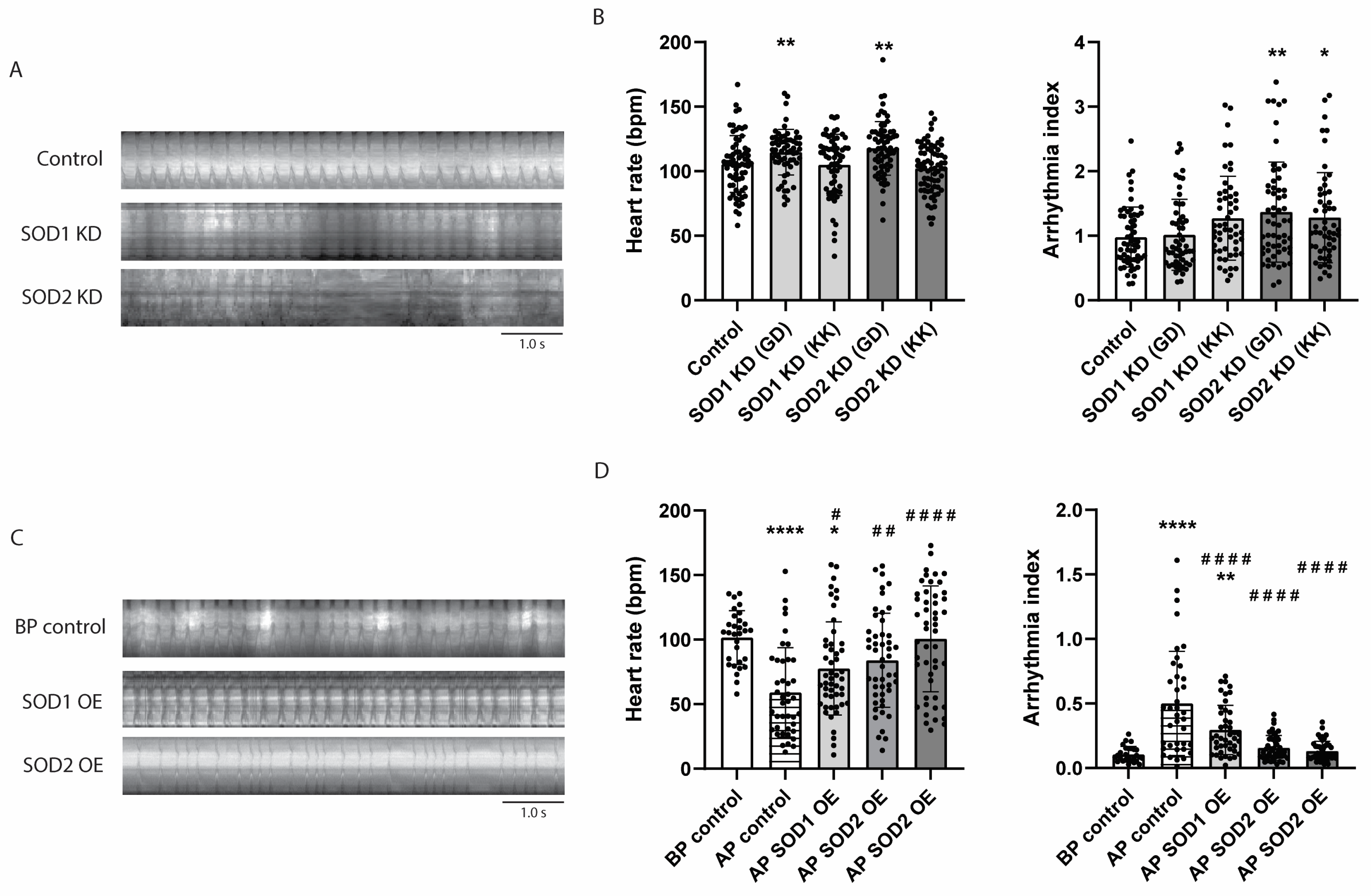 3.6. SOD2 Knockdown Causes Arrhythmia in Drosophila, Whereas Its Overexpression Prevents Tachypacing-Induced Arrhythmia