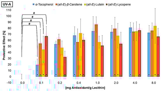 The present results show that the localization of antioxidants has a strong influence on their protective effect. As the antioxidants are located at the edge of the membrane, they can scavenge radicals in the lipophilic phase, and radicals of the aqueous phase penetrate less deeply in the membrane. Also, xanthophylls, which span through the membrane, can function as a radical transfer bridge, causing a pro-oxidative effect in mixtures. Along with the scavenging capacity, the absorption of the wavelength has a remarkable influence, shown by α-tocopherol with its stronger protective effect compared to the carotenoids under UV-C radiation versus UV-A radiation.