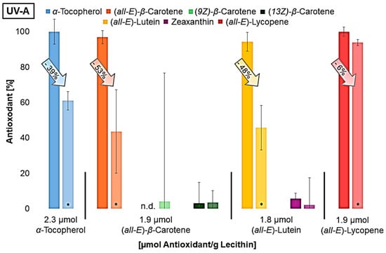 Antioxidant degradation in %, dark bar: non-irradiated liposome solution; lighter bar: irradiated liposome solution; n.d.= not detected; * = significantly different from the non-irradiated sample (n = 9, p-value < 0.05).