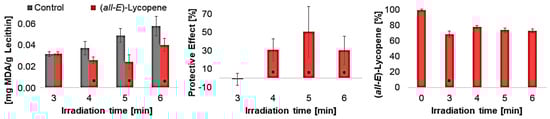 The protective effect initially increased with increasing irradiation time, reaching its maximum at an irradiation time of 5 min, and then decreasing again. At an irradiation time of 6 min, many radicals were produced, leading to decreasing scavenging so that the protective effect decreased. Regarding lycopene degradation, there was no significant difference between the individual irradiation times. Consequently, the speed and quantity of radicals formed are crucial for the effect of lycopene.