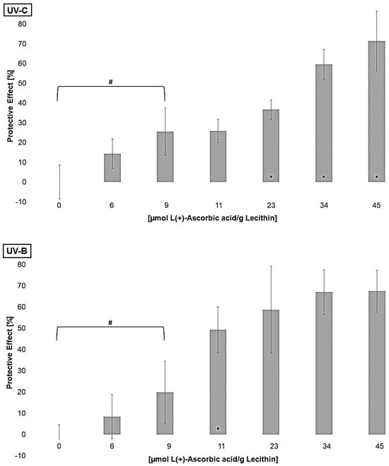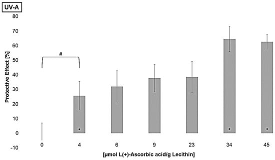 Furthermore, the regenerative effect of vitamin C on lipophilic antioxidants was investigated in order to analyze the enhancement of their effects [61]. Liposomes containing different concentrations of L(+)-ascorbic acid were irradiated to determine the lowest significantly effective concentration of ascorbic acid (Figure 6).