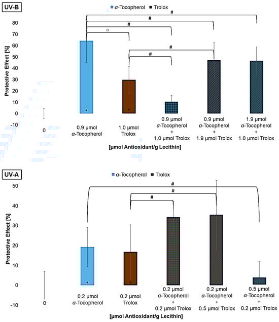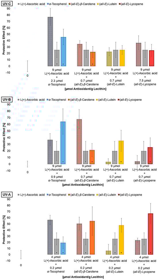 Antioxidants, especially lipophilic antioxidants, absorb ultraviolet (UV) radiation and protect human skin from radicals that lead to oxidation reactions. The differences in the protective effects of carotenoids and α-tocopherol against UV radiation and the possible enhanced effects by the polar antioxidants, vitamin C and Trolox, need further investigation. Therefore, malondialdehyde was analyzed as a biomarker for lipid oxidation using the Thiobarbituric Acid-Assay (TBA-Assay) in liposomes irradiated with UV-C, UV-B, and UV-A radiation (254 nm, 320 nm, and 360 nm). In addition, antioxidant degradation was analyzed using HPLC with a diode array or fluorescence detector. The lipophilic antioxidants differ in their effect mainly due to their polarity and the associated different localization in the lipid bilayer. No pro-oxidative effect was observed at antioxidant concentrations close to saturation. The antioxidant effect was low at small concentrations, mainly due to aggregation of the antioxidants. The protective effect at higher antioxidant concentrations increased from up to 25–72% under UV-C, over 59–77% under UV-B, to 77–86% under UV-A radiation. Vitamin C proved to be 2–40 times less effective depending on the wavelength and the lipophilic antioxidant. Mixtures of lipophilic and hydrophilic antioxidants showed partially additive or synergistic effects. This appears to be dependent on concentration and ratio.