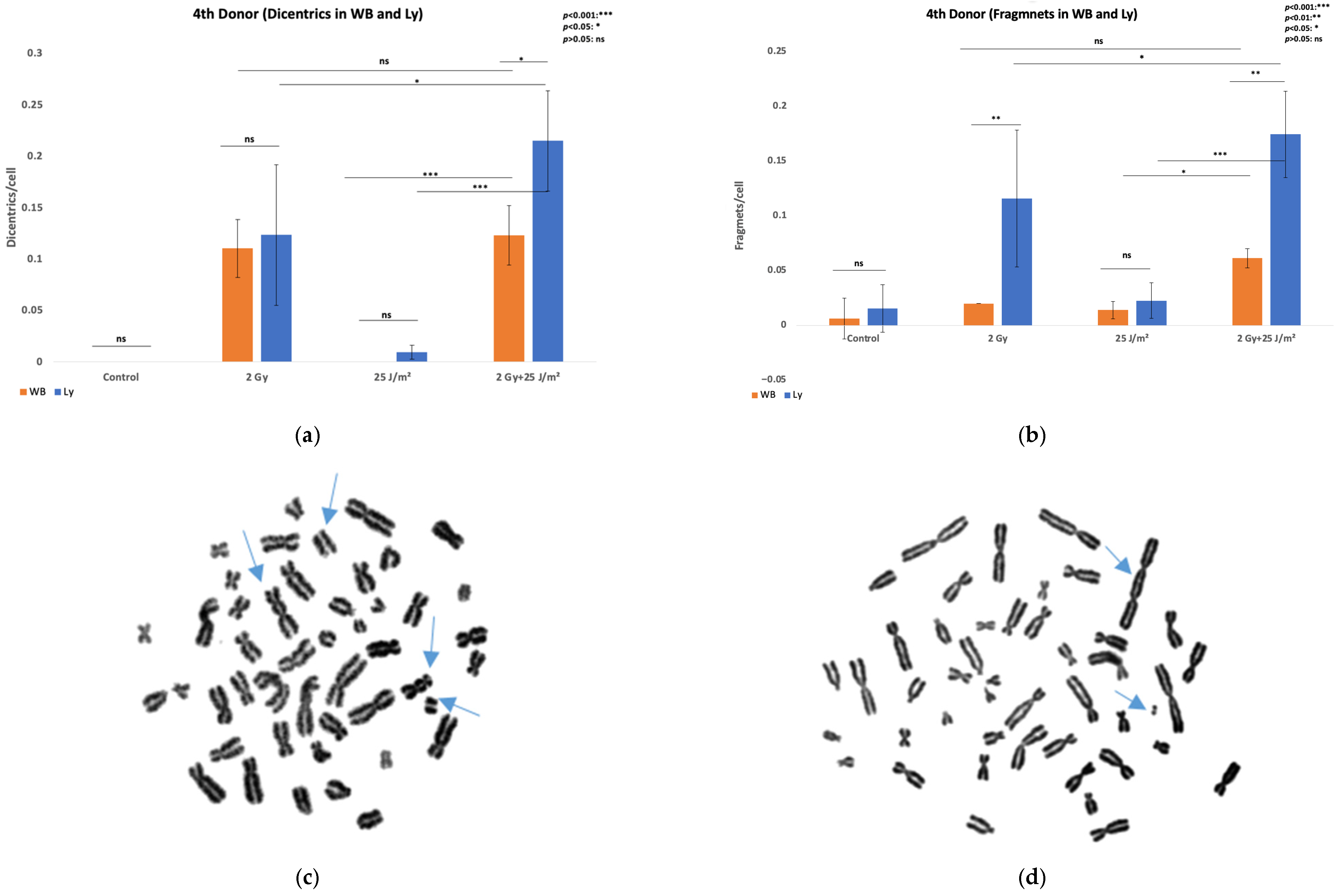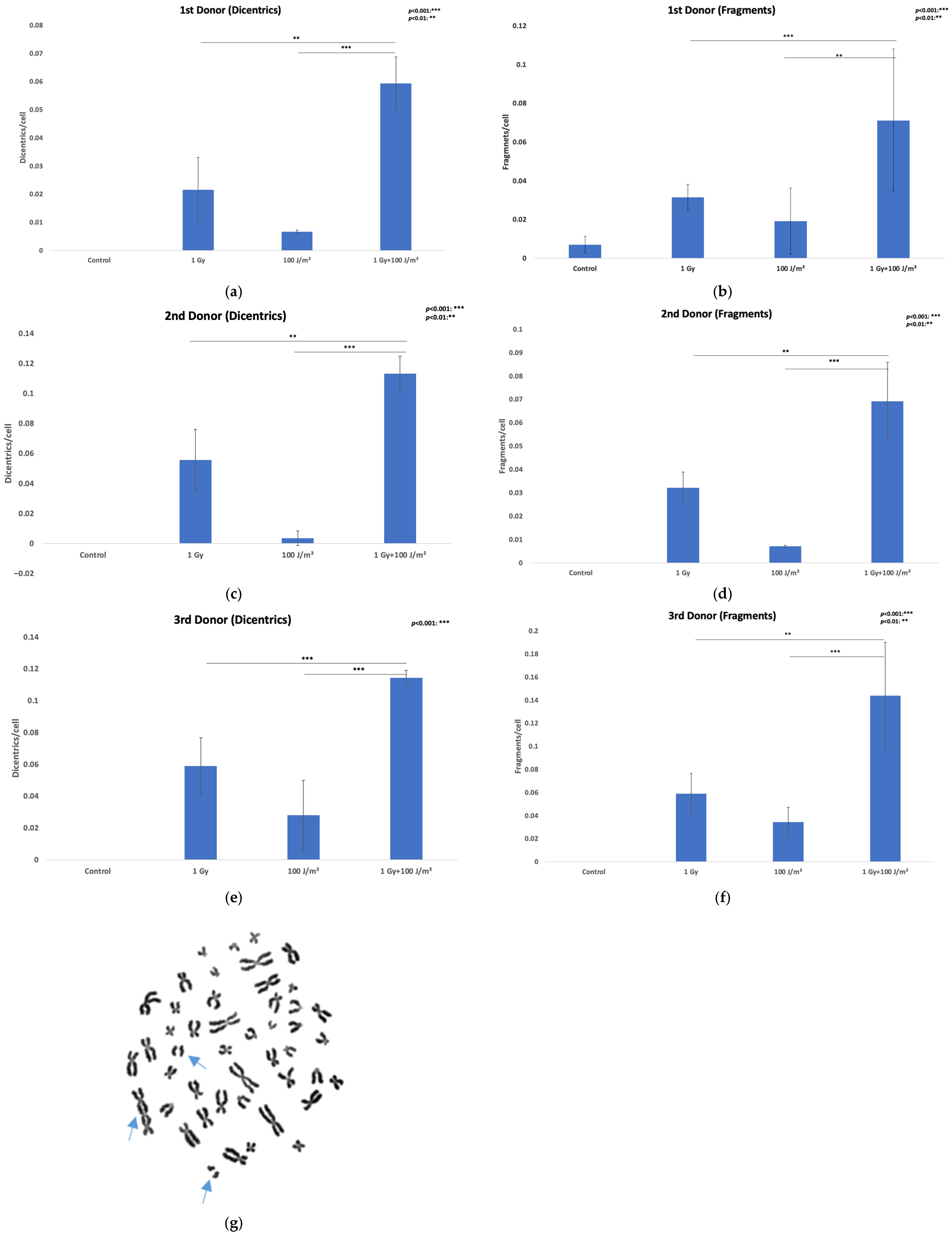 - Holmberg, M.; Strausmanis, R. The repair of chromosome aberrations in human lymphocytes after combined irradiation with UV-radiation (254 nm) and X-rays. Mutat. Res. 1983, 120, 45–50. [Google Scholar] [CrossRef]