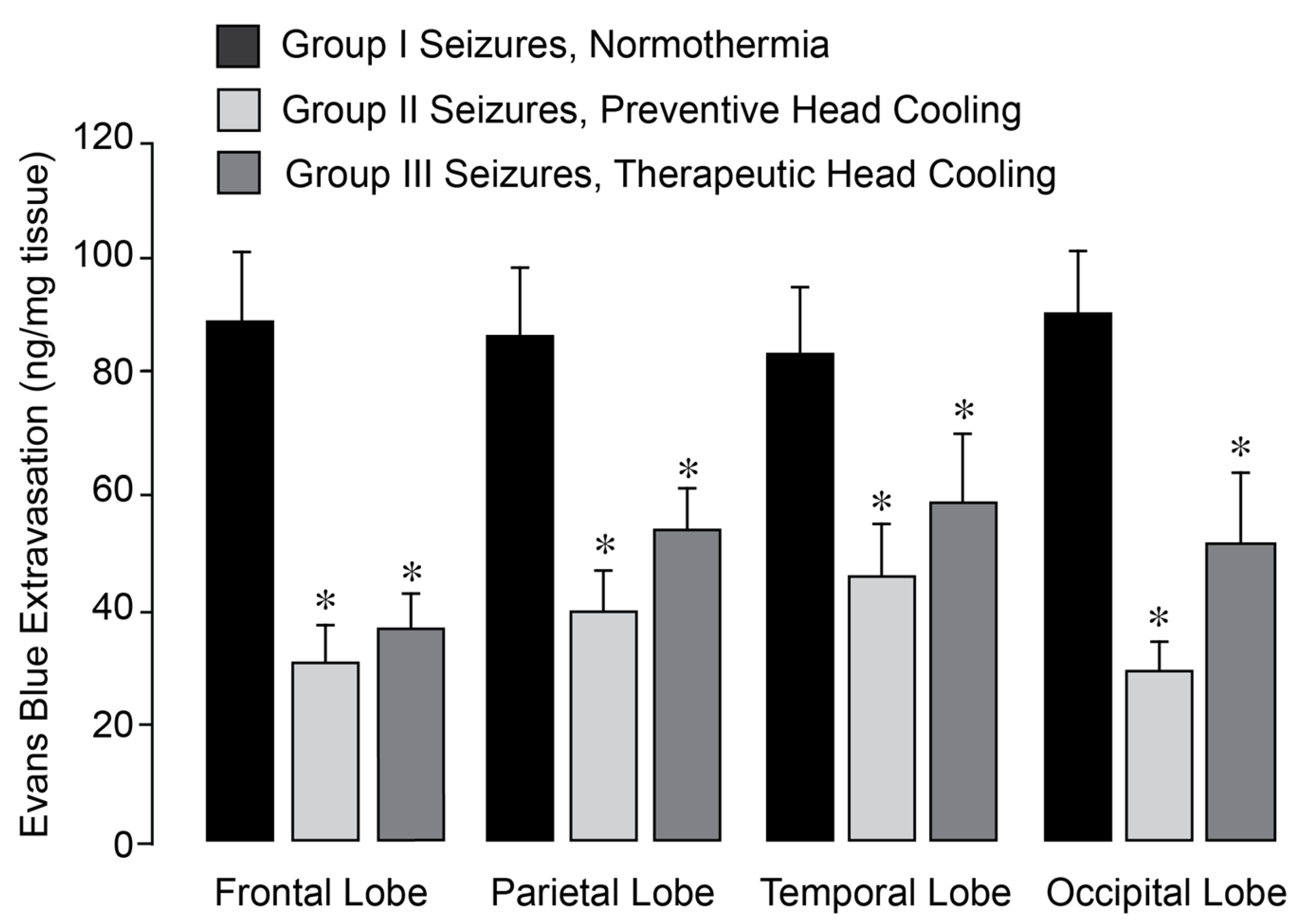 Figure 2. Selective head cooling improved the outcome of epileptic seizures on BBB permeability. Seizures were induced by bicuculline (3 mg/kg, i.p.) in control normothermic pigs (Group I) and in hypothermic pigs (Groups II and III). Selective head cooling was initiated either 30 min before bicuculline administration (preventive cooling, Group II) or 20 min afterwards (therapeutic cooling, Group III), resulting in mild hypothermia (core body temperature, 33.5 ± 0.1 °C; brain cortex temperature, 25.6 ± 0.3 °C). BBB permeability was assessed by measuring Evans Blue extravasation in the frontal, parietal, temporal, and occipital lobes of the brain cortex in postictal newborn pigs after 24 h of recovery following epileptic seizures. N = 6 pigs per group. Values are means ± SD. * p < 0.05, compared with the corresponding control values in normothermic pigs.
