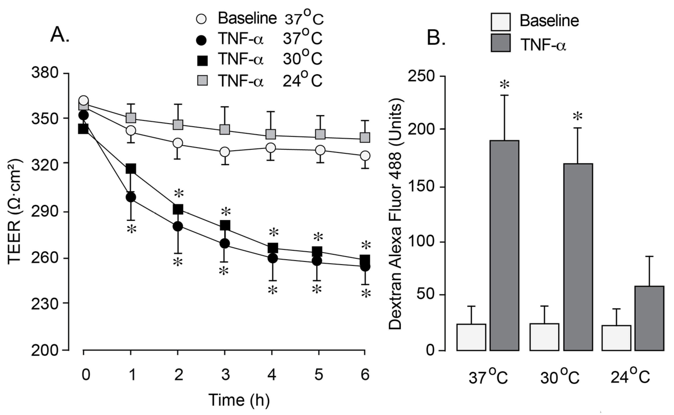 Figure 4. Effects of different levels of hypothermia on BBB permeability in an endothelial BBB model subjected to inflammation-induced oxidative stress. Confluent, quiescent CMVEC grown on semipermeable membranes in Costar Transwells were exposed to human recombinant TNF-α (30 ng/mL) for 1–6 h under normothermic conditions (37 °C) and two levels of hypothermia (30 °C and 24 °C). (A). TEER values (ohms, Ω) were measured using a Millicel electrical resistance system and normalized for the surface area of the cell monolayer. (B). Paracellular permeability of the endothelial monolayer to 3-kDa dextran-conjugated Alexa Fluor 488 was assessed after 6 h of incubation with TNF-α (30 ng/mL). Data represent the average of 4 experiments. Values are means ± SE. * p < 0.05 compared with the baseline values.