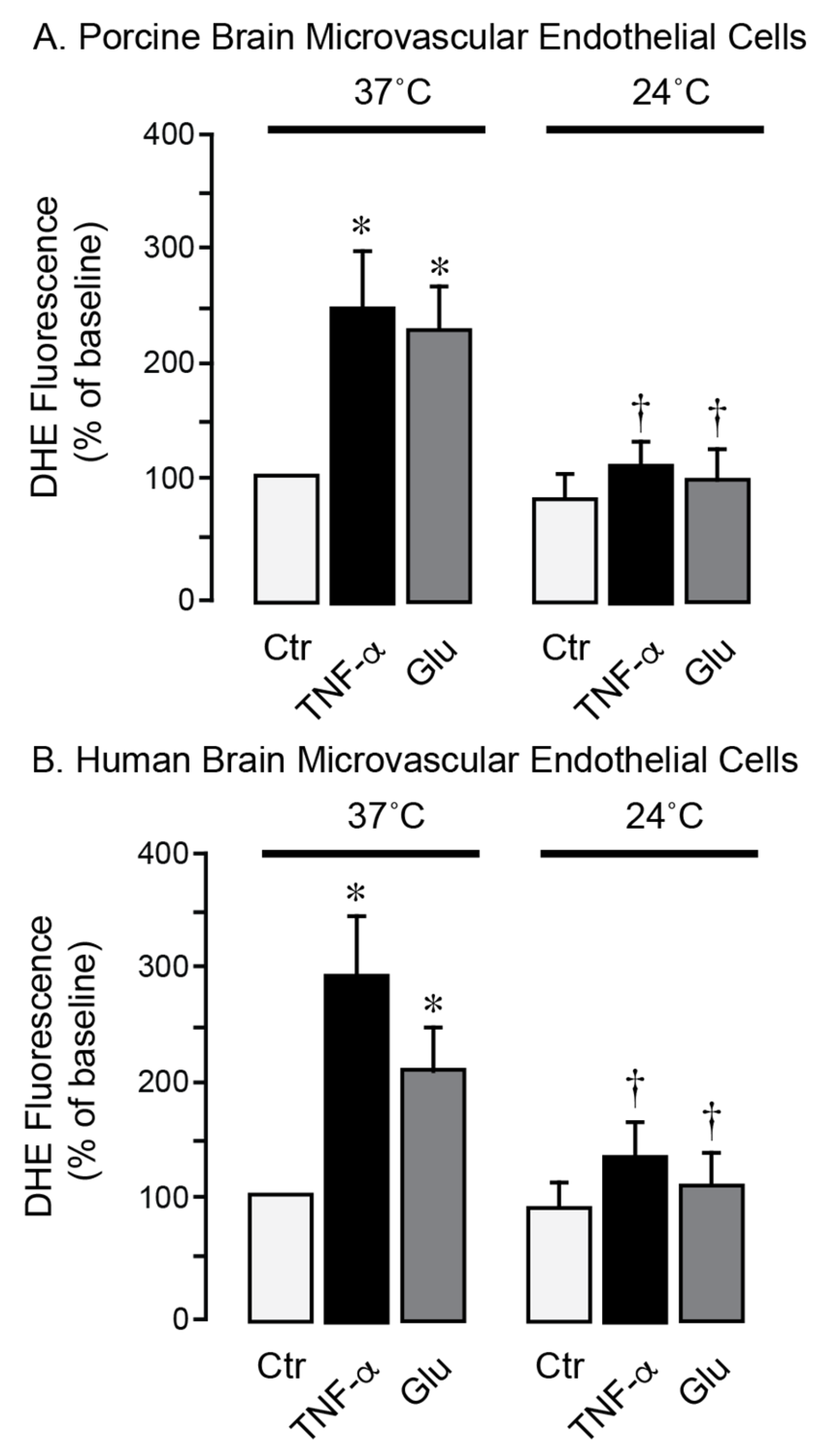 Figure 5. Hypothermia mitigates oxidative stress in porcine and human brain microvascular endothelial cells exposed to inflammatory and excitotoxic mediators. Primary microvascular endothelial cells derived from neonatal porcine brain (A) and adult human brain (B) were treated with TNF-α (30 ng/mL) or glutamate (1 mM) for 1 h during normothermic (37 °C) or hypothermic (24 °C) conditions. Reactive oxygen species were detected by DHE fluorescence and expressed as the % of the baseline control. Data represent the average of 4 independent experiments. Values are means ± SD. * p < 0.05 compared with the corresponding baseline value. p < 0.05 compared with corresponding normothermia values.