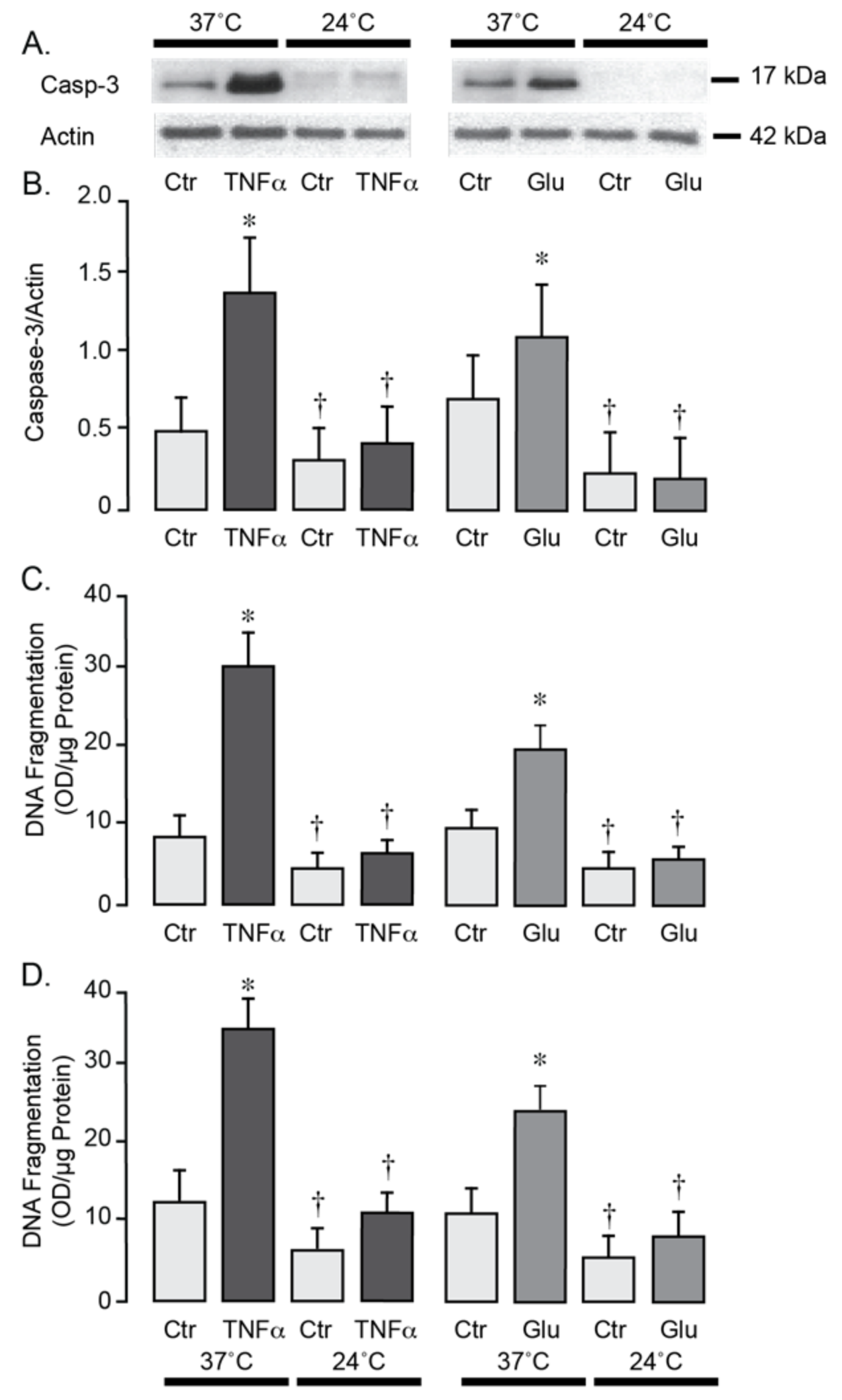 Figure 6. Hypothermia confers resistance to apoptosis in porcine (AC) and human (D) cerebral microvascular endothelial cells during inflammation and excitotoxicity. Confluent quiescent piglet and human brain microvascular endothelial cells were treated with TNF-α (30 ng/mL) or glutamate (1 mM) for 3 h under normothermic (37 °C) or hypothermic (24 °C) conditions. Caspase-3 activation was assessed by Western immunoblotting (representative blot shown in (A)) and normalized to actin as the internal control (B). Apoptotic DNA fragmentation was quantified, normalized to protein amount, and expressed as (OD/µg protein) (C,D). Data represent the average of 4 independent experiments. Values are means ± SE. * p < 0.05 compared with the control values. † p < 0.05 compared with the corresponding normothermia values.