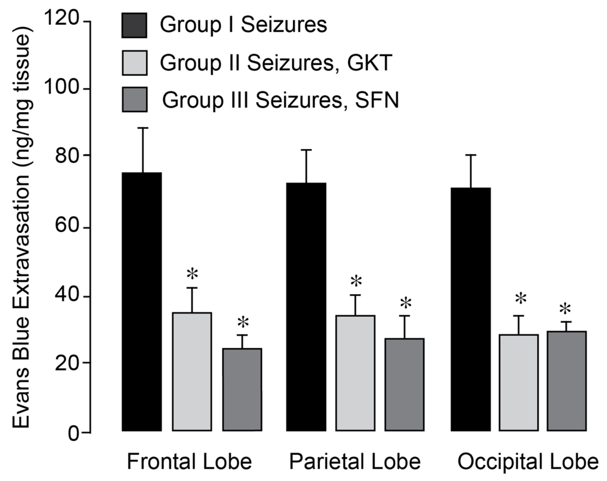 Figure 8. NOX inhibitors improved the outcome of epileptic seizures on BBB permeability. Seizures were induced by bicuculline (3 mg/kg, i.p.) in normothermic pigs, untreated (Group I) and pretreated with Nox inhibitors setanaxib (GKT, 5 mg/kg i.p, Group II) or sulforaphane (SFN, 0.4 mg/kg i.p, Group III). BBB permeability was detected by the Evans Blue extravasation in the frontal, parietal, and occipital lobes of the brain cortex 24 h after bicuculline administration. N = 4 pigs per group. Values are means ± SD. * p < 0.05, compared with the corresponding control values in untreated pigs.