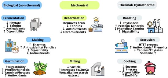 Figure 1 summarizes the principal conventional processing techniques of pearl millet and their influence on nutritional quality and antinutritional factors.