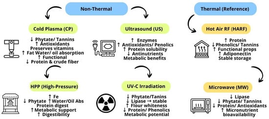 Furthermore, advanced pearl millet processing techniques, such as emerging thermal and non-thermal sustainable methods, are among the most advanced technologies currently employed in the food industry. These techniques have been used to extend shelf life, enhance nutritional quality, and ensure food product safety. Non-thermal techniques include cold plasma, ultrasound, high-pressure, and ultraviolet radiation [24,25,26], whereas thermal techniques include microwave and hot-air-assisted radio frequency.