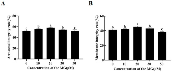 Effects of MG supplementation in the freezing extender on the acrosome and plasma membrane integrity of boar sperm after thawing. (A) Acrosome integrity. (B) Plasma membrane integrity. Values are expressed as mean ± SD (n = 5). Different letters indicate significant differences (p < 0.05).