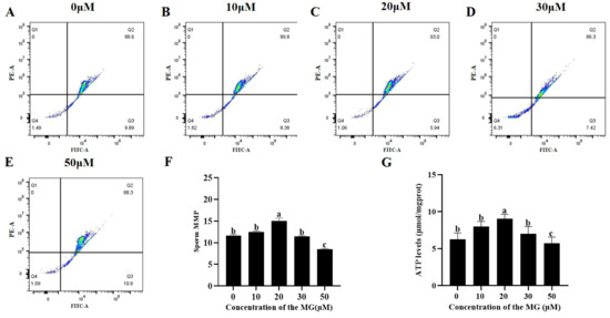 The MMP and ATP levels of sperm from each group were determined following the freezing–thawing process. The results are shown in Figure 2, compared to the control group, supplementation with 20 μM MG in the freezing extender significantly increased both MMP and ATP levels (p < 0.05), whereas the 10 and 30 μM MG groups showed no significant differences (p > 0.05). In addition, the 50 μM MG group exhibited significantly lower MMP and ATP levels compared to the control group (p < 0.05).