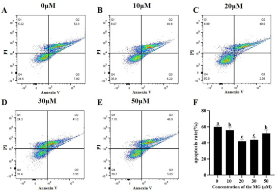 Apoptosis levels in post-thaw sperm were evaluated across groups. The results are shown in Figure 5, supplementation with MG in the freezing extender significantly reduced apoptosis compared to the control group (p < 0.05), with the 20 μM MG group showing the lowest levels.