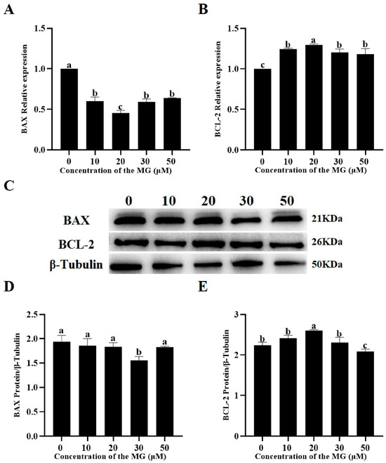 The effects of MG on apoptosis-related gene and protein expression were examined using RT-qPCR and Western blot. RT-qPCR results indicated that supplementation with 10, 20, 30, and 50 μM MG significantly upregulated mRNA expression of the anti-apoptotic factor BCL-2 compared to the control group (p < 0.05), with the 20 μM MG group showing significantly higher levels than the 10, 30, and 50 μM groups (p < 0.05) (Figure 6A). Conversely, all MG concentrations significantly downregulated mRNA expression of the pro-apoptotic protein BAX compared to the control group (p < 0.05), with the 20 μM MG group exhibiting significantly lower levels than the 10, 30, and 50 μM groups (p < 0.05) (Figure 6B). Western blot analysis revealed that 20 μM MG significantly increased BCL-2 protein expression compared to the control group (p < 0.05), whereas the 50 μM MG group showed significantly lower expression (p < 0.05) (Figure 6C,E). In addition, 30 μM MG significantly decreased BAX protein expression (p < 0.05), while the 10, 20, and 50 μM MG groups showed no significant differences from the control (p > 0.05) (Figure 6C,D).