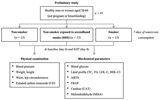 During the intervention period, participants consumed 60 g of fresh watercress with each of three daily meals for seven consecutive days, following the amount used in the prior study [20]. Participants were also instructed to avoid other cruciferous vegetables throughout the intervention. At the end of the treatment phase, blood samples were again collected for laboratory measurements, biochemical analyses, and comprehensive physical assessments including measurements of vital signs and exhaled carbon monoxide were performed again to evaluate post-intervention changes. The study design is presented in Figure 1.