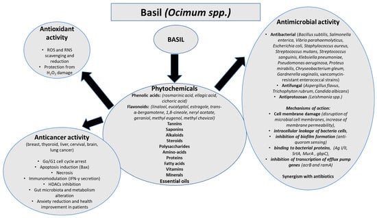 Herbs and spices were extensively used many years ago due to their flavor and aroma in cuisine. Additionally, their phytochemical constituents have been reported for their health benefits. Recent research on natural products as agents for prevention, disease therapy, and health promotion has been extensively conducted. Basil is a herb used in many countries, which was reported to have beneficial effects due to its phytochemicals. In this review, we made a comprehensive presentation of the recent literature on the antioxidant, antimicrobial, and anticancer properties of basil, as shown in Figure 1.