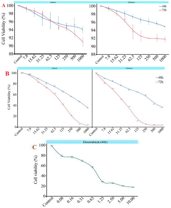 The results revealed a significant, concentration- and time-dependent decrease in cell viability for both extracts (p < 0.05). Notably, the methanol extract exhibited significantly higher cytotoxicity at most concentrations. At the lowest concentration (7.8 µg/mL), cell viability was largely maintained in both extracts after 48 h, remaining above 96%. However, after 72 h, a statistically significant reduction in viability was observed for the methanol extract, decreasing from 89.61% at 48 h to 81.31% (p < 0.05), indicating early cytotoxic potential. At 62.5 µg/mL, the methanol extract reduced viability to 37.99% after 72 h (Figure 2). This value was significantly lower than the 48-h value (68.91%) and the ethanol extract value at the same time point (62.20%) (p < 0.05). Similarly, at 125 µg/mL, the methanol extract caused a dramatic decrease in viability, reducing it to 11.17% at 72 h. This was significantly lower than the ethanol extract’s viability at the same time point (42.07%) (p < 0.05), which further confirms the methanol extract’s stronger cytotoxic profile. At a concentration of 250 µg/mL, the methanol extract significantly reduced cell viability to 5.29%. This is notably lower than the 21.07% viability observed for the ethanol extract at the same time point (p < 0.05). The maximum cytotoxic effect was observed after 72 h at a concentration of 500 µg/mL: viability was 4.04% for the methanol extract and 5.11% for the ethanol extract. Both values were significantly lower than their respective 48-h measurements (p < 0.05). These results suggest that G. lucidum extracts exhibit time- and dose-dependent cytotoxicity, with the methanol extract demonstrating significantly greater effects at various concentrations and time points. The methanolic and ethanolic extracts of G. lucidum demonstrated more than 90% cell viability in MCF-10A healthy breast cells after 48 and 72 h of incubation. At lower concentrations, cell viability remained in the range of 97% to 100%, with only slight reductions noted at higher concentrations. Similar to G. lucidum treatments, cell viability decreased in a dose-dependent manner with increasing doxorubicin concentration. While the cell viability was 79.21% at 0.078 μM doxorubicin, a progressive decline was observed, decreasing to 17.95% at 10 μM treatment (Figure 2).