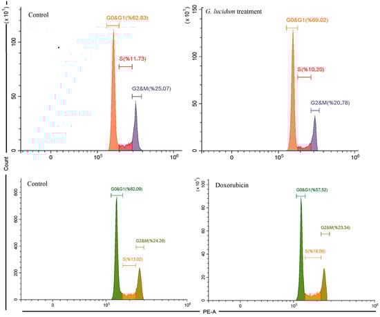 Flow cytometry analysis of DNA content indicated that treatment with G. lucidum methanol extract led to changes in the cell cycle distribution of MCF-7 cells (Figure 3). In the control group, 63.83% of the cells were in the G0/G1 phase, 11.73% in the S phase, and 25.07% in the G2/M phase. After treatment with the G. lucidum methanol extract, there was a significant increase in the G0/G1 population, rising to 69.02%. Additionally, the percentages of cells in the S phase decreased to 10.2% and in the G2/M phase to 20.78% compared to the control group. These findings suggest that the methanol extract of G. lucidum may inhibit cell cycle progression by causing an arrest in the G0/G1 phase, which could contribute to reduced cell proliferation and the induction of apoptosis. Doxorubicin induced cell cycle arrest in the S phase, increasing from 13.02% to 19.09%, while reducing the G0&G1 phase and showing a slight decrease in the G2&M phase (Figure 3).