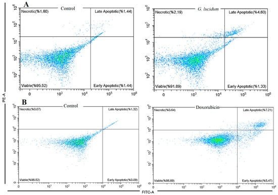 Apoptosis in MCF-7 cancer cells by the treatment of G. Lucidum-Methanol (A) and doxorubicin (B).