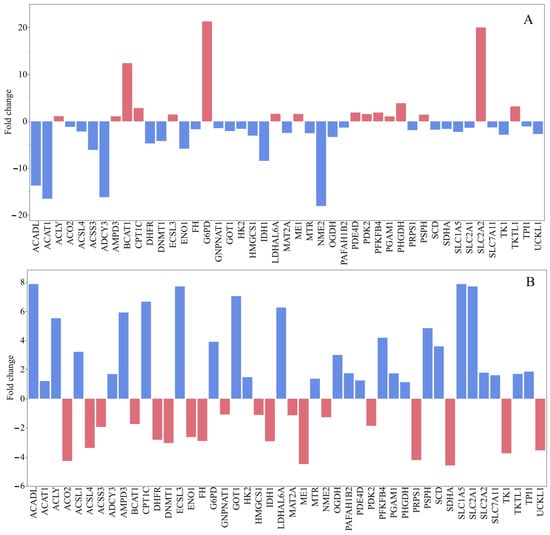Downregulated Metabolic Genes: Conversely, a significant downregulation was observed in ACAT1 (−16.51), indicating a severe inhibition of acetyl-CoA metabolism and cholesterol homeostasis. NME2 (−18.06) and ADCY3 (−16.17), both involved in nucleotide metabolism and cyclic AMP signaling, respectively, were also sharply downregulated. Additionally, ACADL (−13.69) and IDH1 (−8.43) showed notable decreases, suggesting impaired fatty acid β-oxidation and disrupted flux in the TCA cycle. The glycolytic enzyme ENO1 experienced a decline of −5.84, while ACSS3, a regulator of acetate metabolism, decreased by −6.08. Moderate reductions were also noted in DHFR, DNMT1, SLC1A5, and MAT2A, with changes ranging from −4 to −2 (Figure 5A). These suggest repression of folate metabolism, DNA methylation, amino acid transport, and methylation cycles. Collectively, these patterns indicate a reorganization of the metabolic network toward a bias for glycolysis and biosynthesis, while oxidative phosphorylation and mitochondrial metabolism appear to be downregulated.