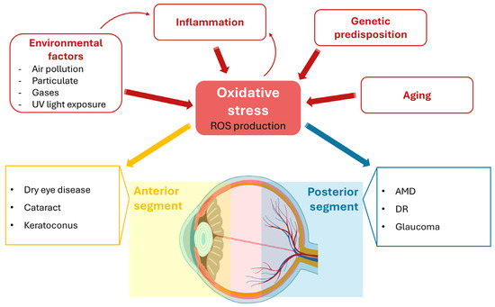 Figure 1. The complex etiology of oxidative stress (OS) in the ocular system. The eye is highly susceptible to OS due to chronic light exposure and high metabolic demands. OS results from an imbalance between reactive oxygen species (ROS) production and anti-oxidant defenses, driven by various factors, including environmental exposure, inflammation, aging, and genetic predisposition. ROS-mediated damage in the anterior segment (cornea, conjunctiva, lens) contributes to conditions such as dry eye disease, cataract, and keratoconus. The posterior segment (retina, optic nerve), which exhibits high metabolic activity and oxygen consumption, is also inherently prone to oxidative damage, leading to various eye diseases, such as age-related macular degeneration (AMD), diabetic retinopathy (DR), and glaucoma.