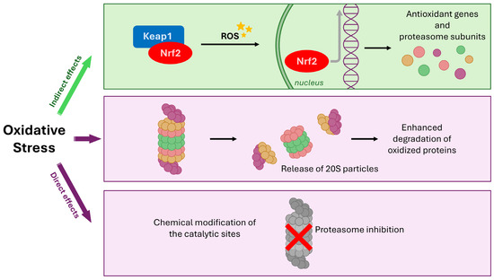 The OS-related dysfunction of the proteasome establishes a detrimental self-perpetuating cycle in which decreased clearance of oxidized proteins further amplifies the intracellular stress burden. In the attempt to counteract these direct effects, ROS accumulation triggers a complex cellular stress response that can indirectly stimulate proteasome activity. The Nuclear factor erythroid 2-related factor 2 (Nrf2) is the main transcriptional factor which drives cellular response to OS. Under physiological conditions, Nrf2, in complex with its repressor Keap1, remains in the cytosol. Oxidation of Keap1 induces the translocation of Nrf2 to the nucleus, where it induces the transcription of anti-oxidant and detoxification genes. Notably, Nrf2 also promotes the expression of certain gene-encoding subunits of the 20S and 19S proteasome, representing a feedback loop where oxidative stress indirectly upregulates proteasome components in an attempt to compensate for its damage and overload (Figure 2) [47,48,49].