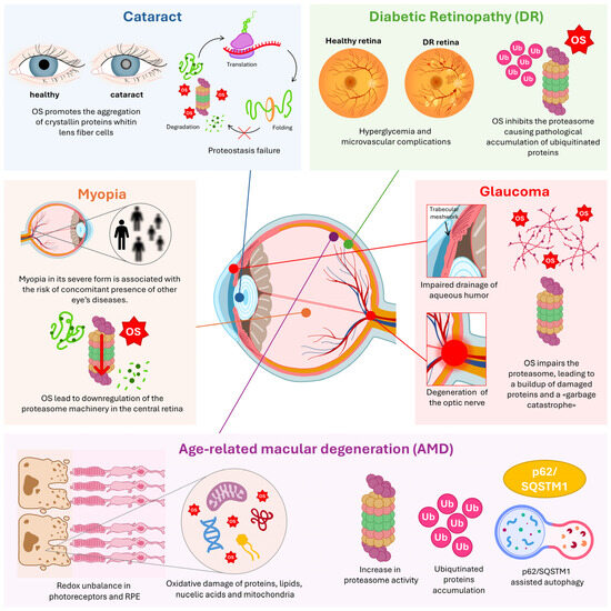 Myopia in its severe form is associated with the risk of the concomitant presence of other eye diseases. In the literature, the evidence of oxidative stress participation in the development of myopia is reported [101]. Recently, a proteomic study shared some results about the proteome changes in retina. The most significant changes were in the far-periphery retina after myopia induction, followed by the central retina. Proteasome pathway was significantly downregulated in differentially expressed proteins in the central retina [102] (Figure 3).