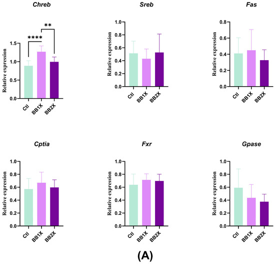 The effects of BB in the liver (n = 8). Bar plots show the relative mRNA expression levels for the following groups: control (Ctl, green), BB1X (2.3 ± 0.26 mg/day dose, light purple), and BB2X (4.8 ± 0.18 mg/day dose, dark purple). Genes are categorised as follows: (A) Metabolism genes, (B) immunity genes, and (C) oxidation genes. Values represent mean ± SD. Statistical significance was determined via one-way ANOVA (* p < 0.05, ** p < 0.01, *** p < 0.001, and **** p < 0.0001).